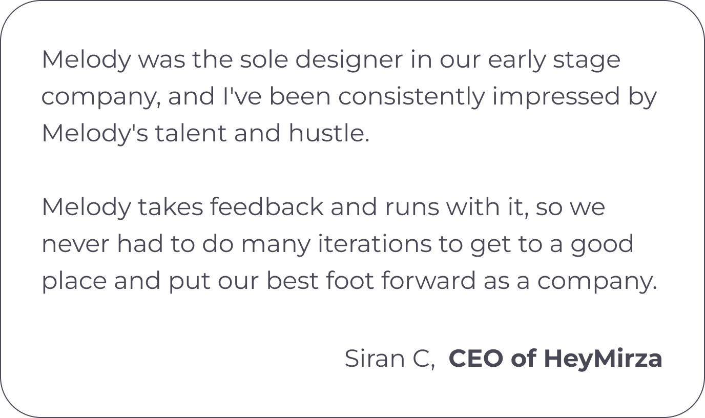 Iβm Melody! A product designer with experience working 0-1 on all platforms (mobile, web, and mobile web).
