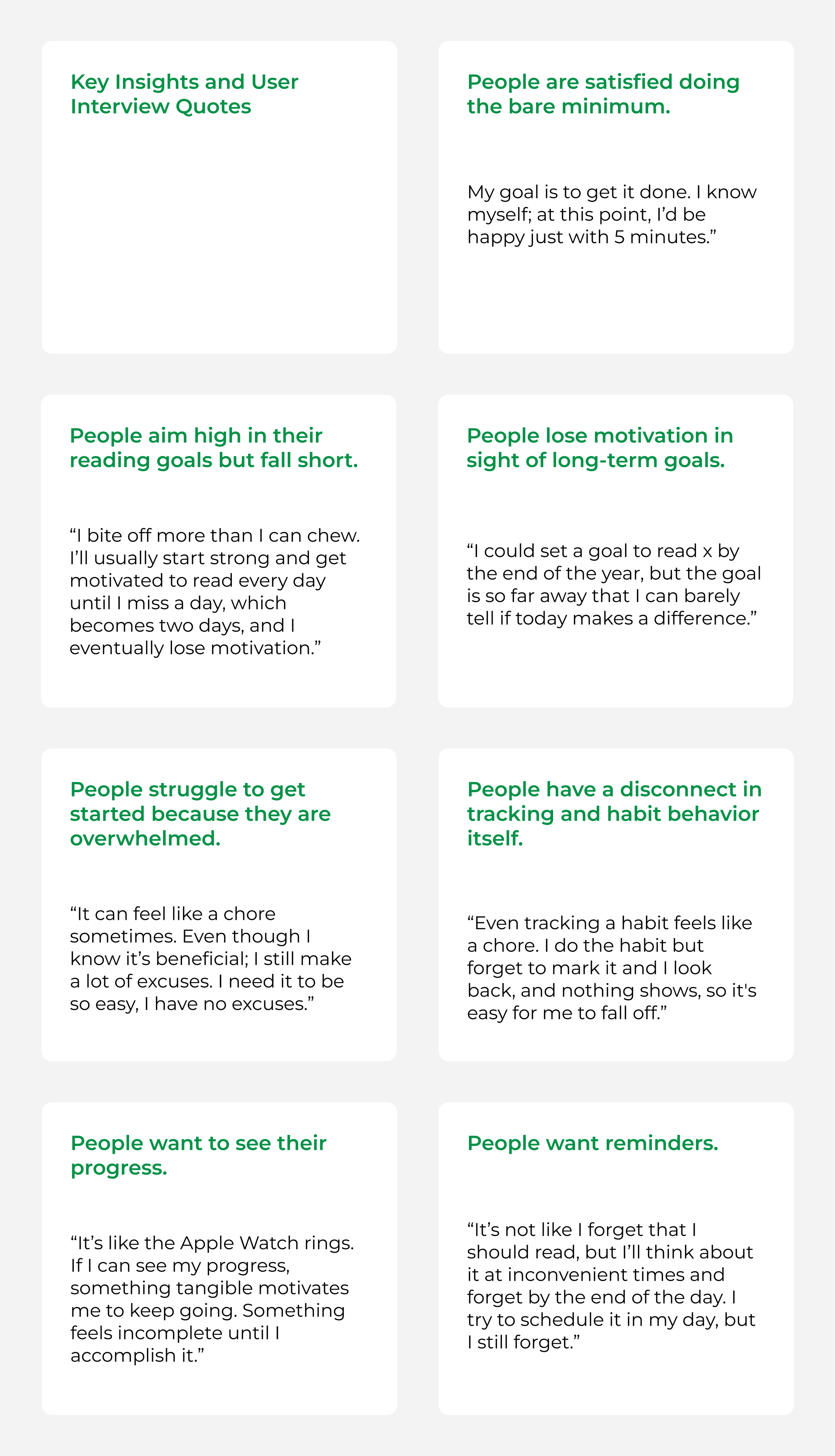 Since the stakeholders wanted to appeal to the younger demographic of Gen Z and millennials, I interviewed a range of people including college students, working adults, and parents. I sought to validate my assumptions of whether these individuals had the desire to build this habit and if they did, how would it fit into their existing schedules.