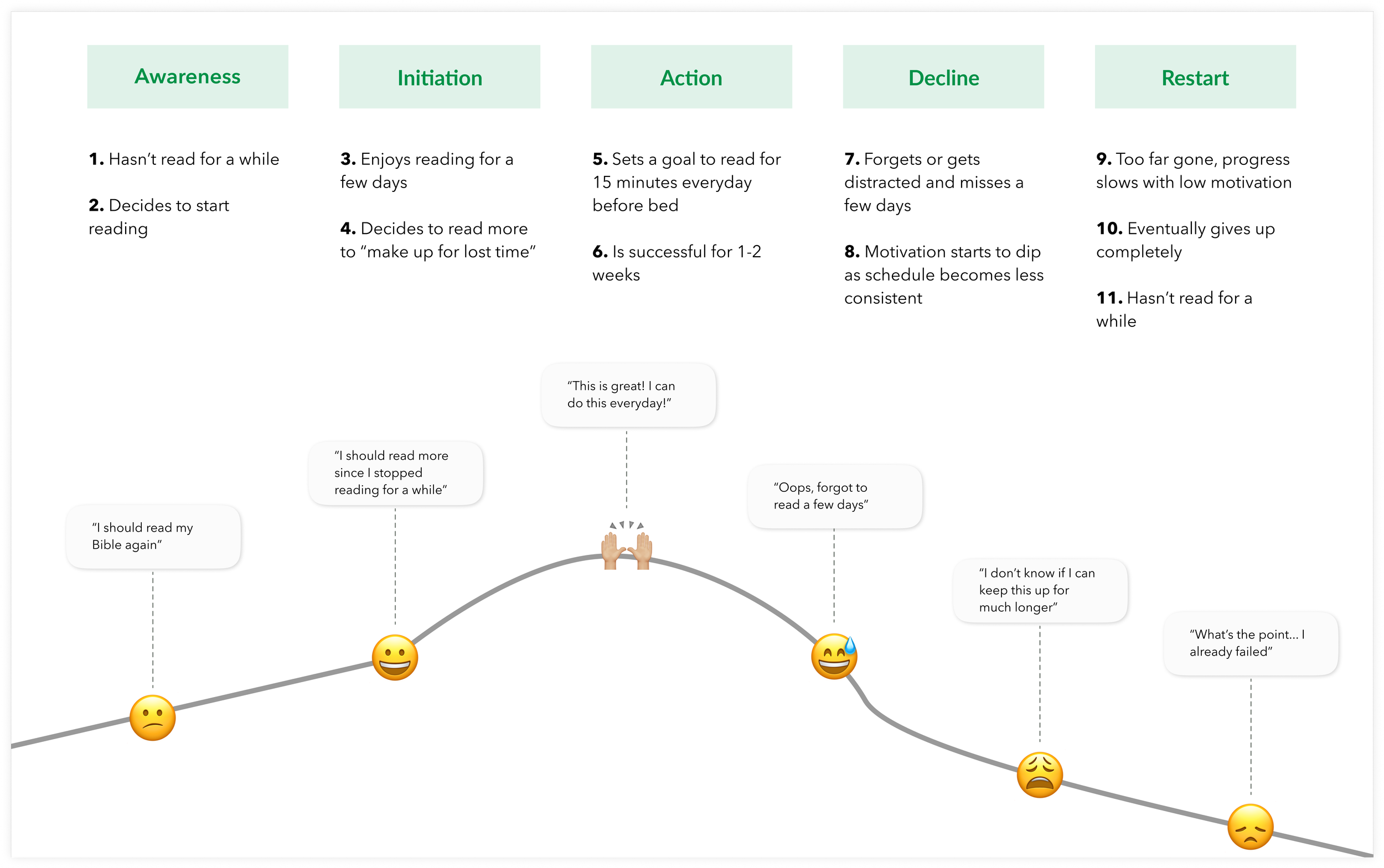 It helped me consider how we could reduce any opportunity for abandonment at every touchpoint, from schedule creation to reading within the app to marking their reading as complete and seeing their progress toward set goals.