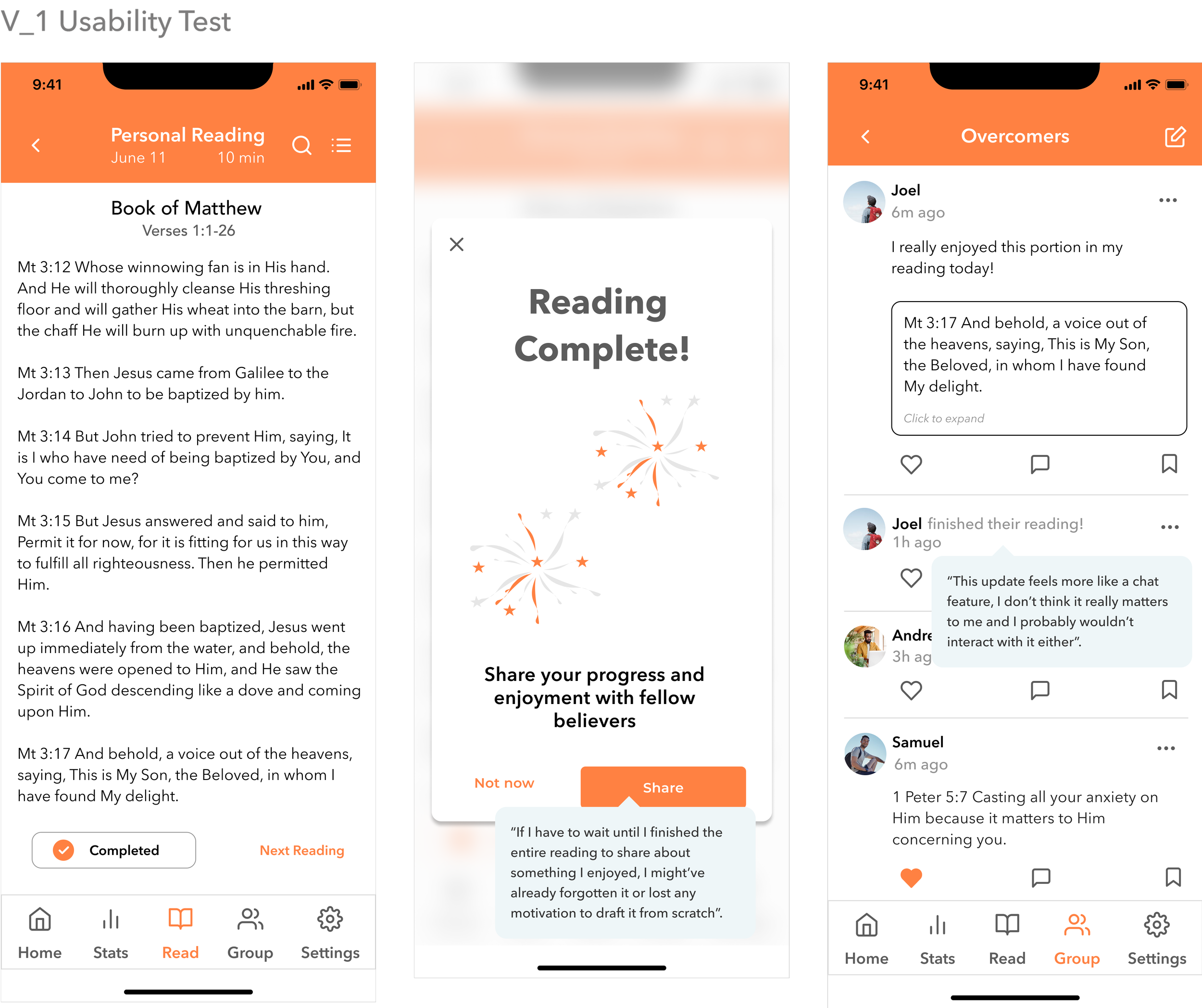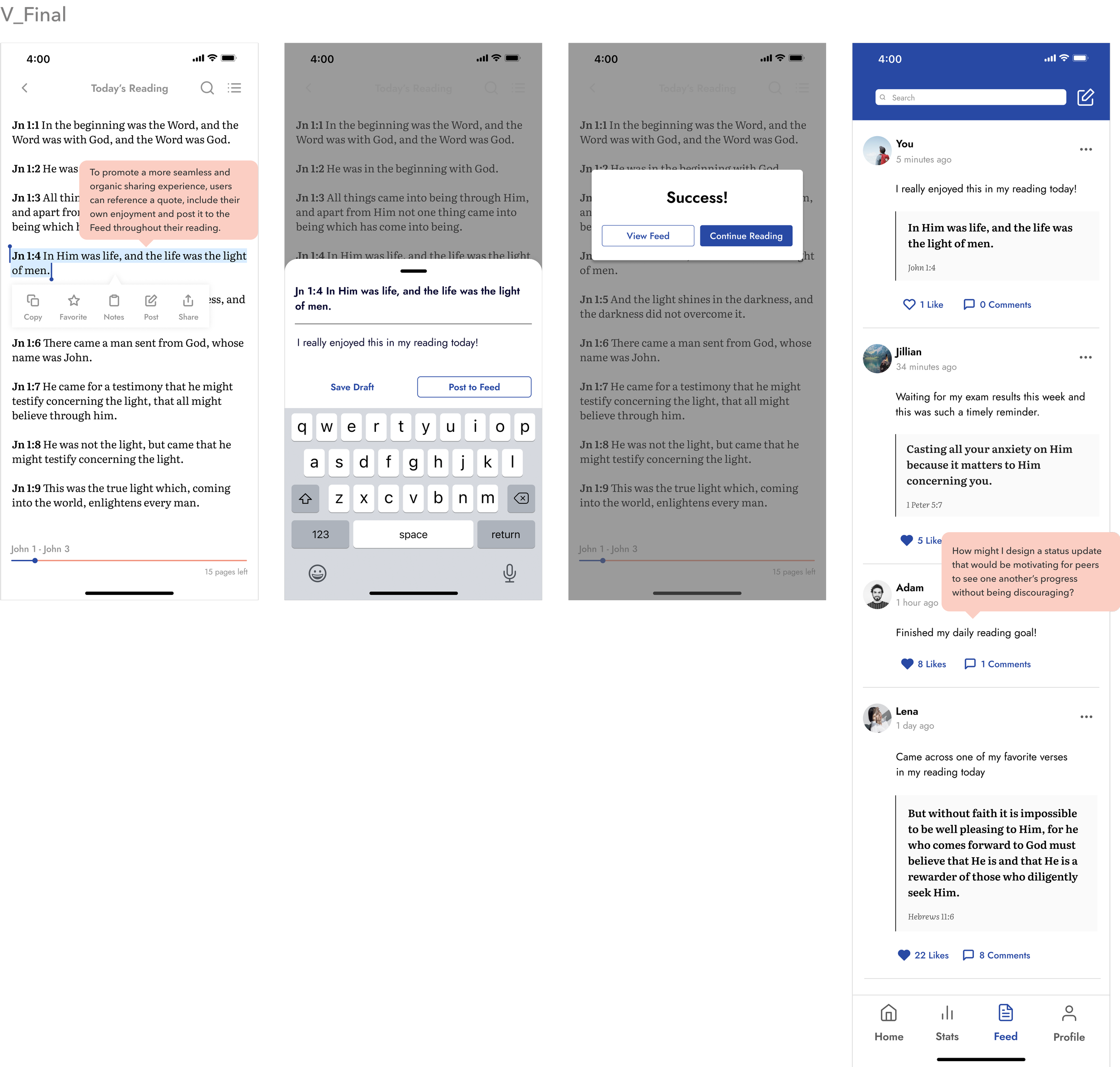 User feedback informed significant iteration to the scheduling flow and sharing enjoyment from the reading experience to the Feed.