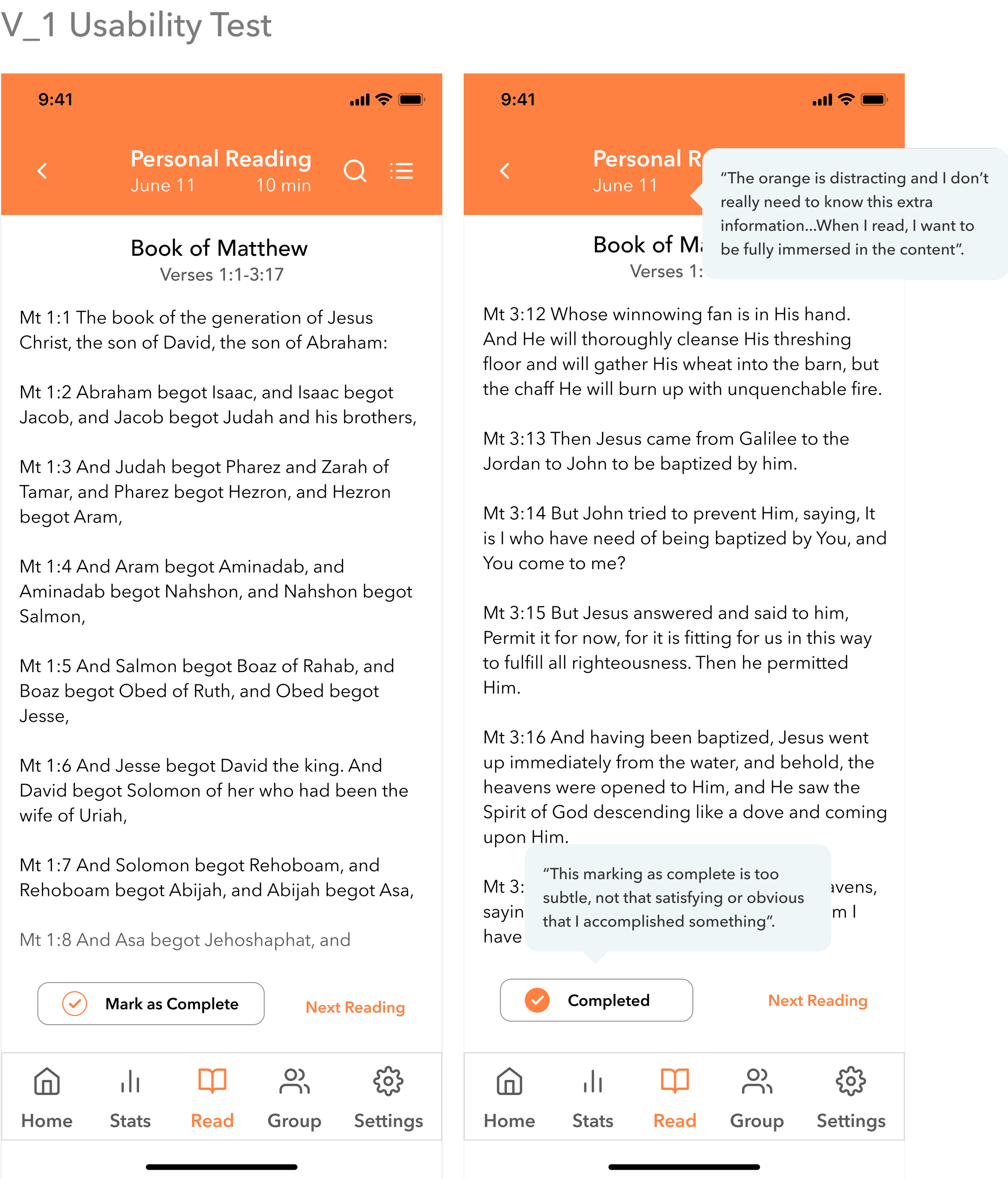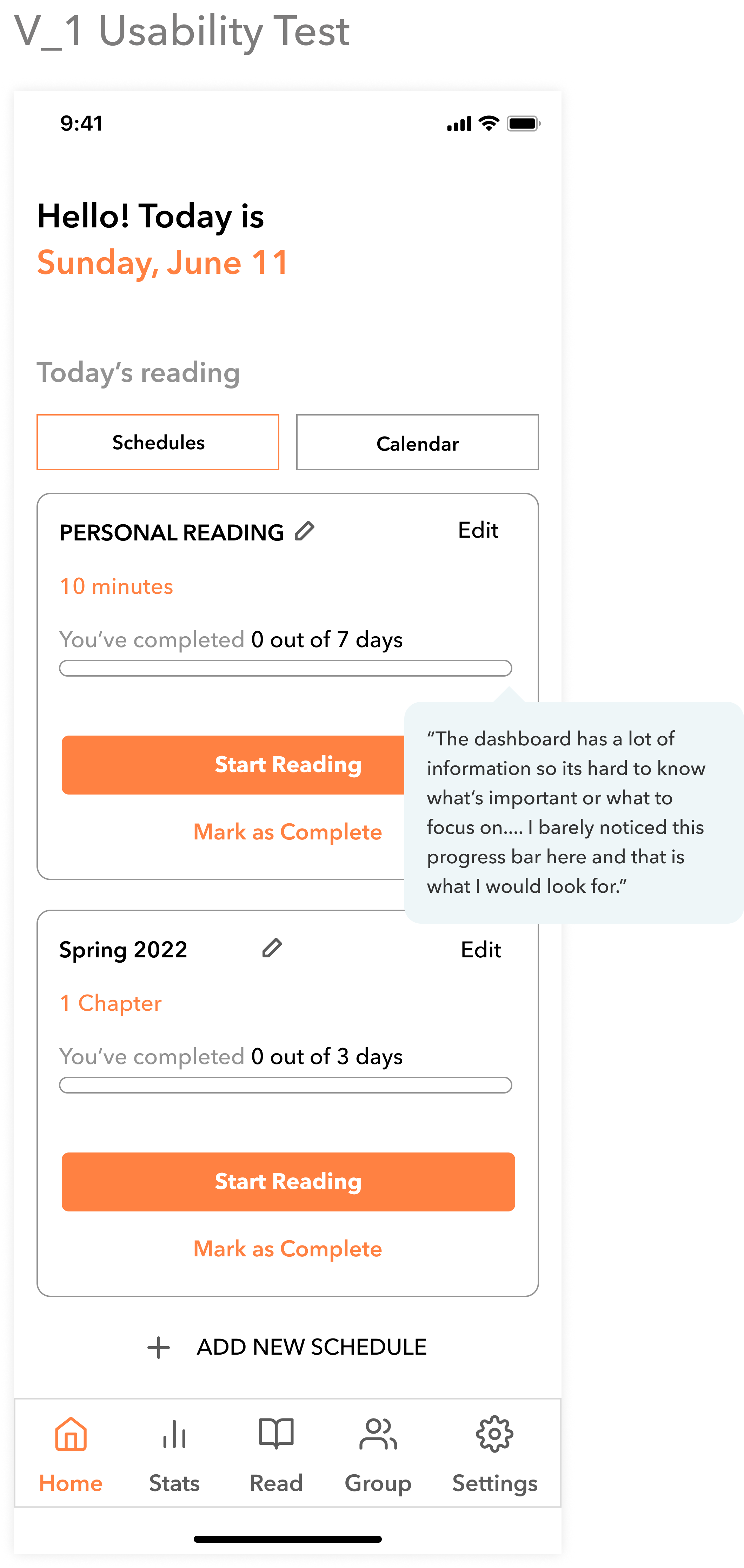 Users gave feedback on how reading progress, weekly schedule and reading CTA should be displayed.